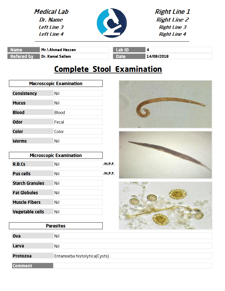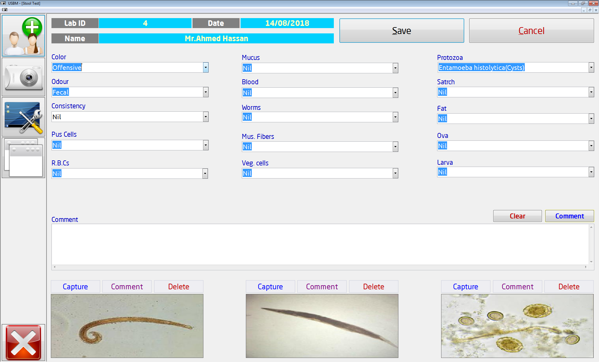 USBM software helps the laboratory store patient results for Complete Urine, Stool, Blood and Myelogram examinations along with pictures captured from the microscope using an eye piece camera.